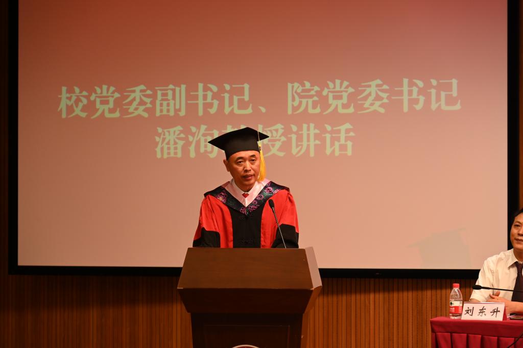 最后,校党委副书记、院党委书记潘洵教授讲话,他代表学校党委向毕业同学致以了最热烈的祝贺,他肯定了马院学子在各自领域取得的累累硕果。“人生万事须自为,跬步江山即寥廓。”他叮嘱同学们追求进步,是青年最宝贵的特质,并对毕业生们提出了三点希望:一是用理想引领青春之路,做马克思主义的坚定信仰者。二是用奋斗谱写青春之歌,做伟大复兴事业的积极贡献者。三是用知识点燃青春之火,做人生赛道上的最强奔跑者。最后,他祝愿毕业生们不忘初心、一往无前,乘东风浩荡、扬鹏程万里。