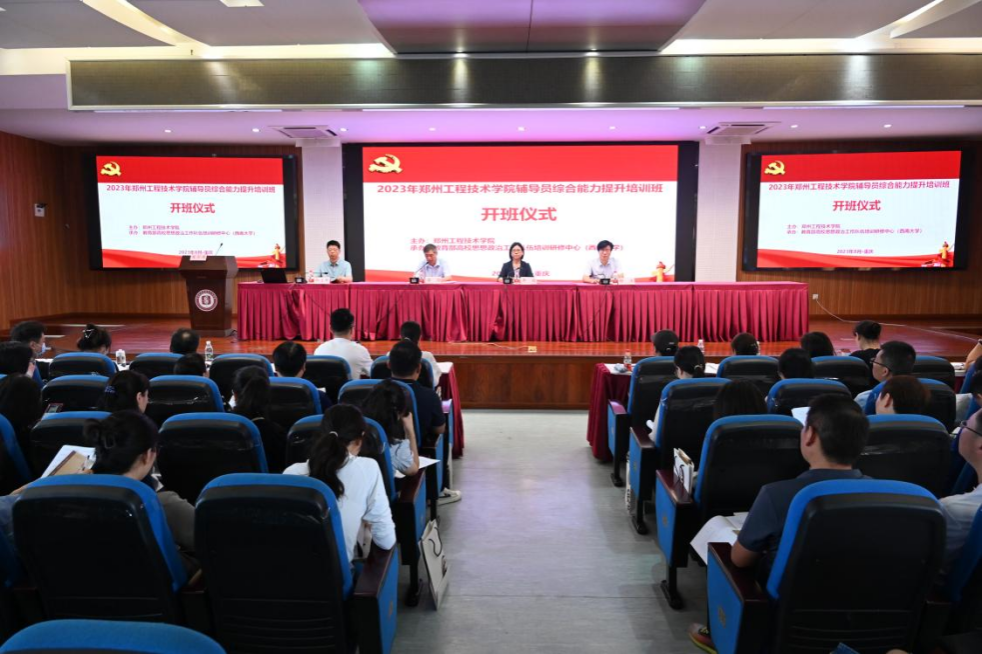 2023年8月2日上午,郑州工程技术学院辅导员综合能力提升培训班在yl88858永利中国505汇报厅顺利开班。郑州工程技术学院副校长李欣,yl8858永利集团党委副书记、yl88858永利中国院长(兼)潘洵,郑州工程技术学院党委学生工作部(处)处长解浩出席本次开班仪式。本次会议由yl88858永利中国副院长、教育部高校思想政治工作队伍培训研修中心(yl8858永利集团)办公室主任靳玉军主持。