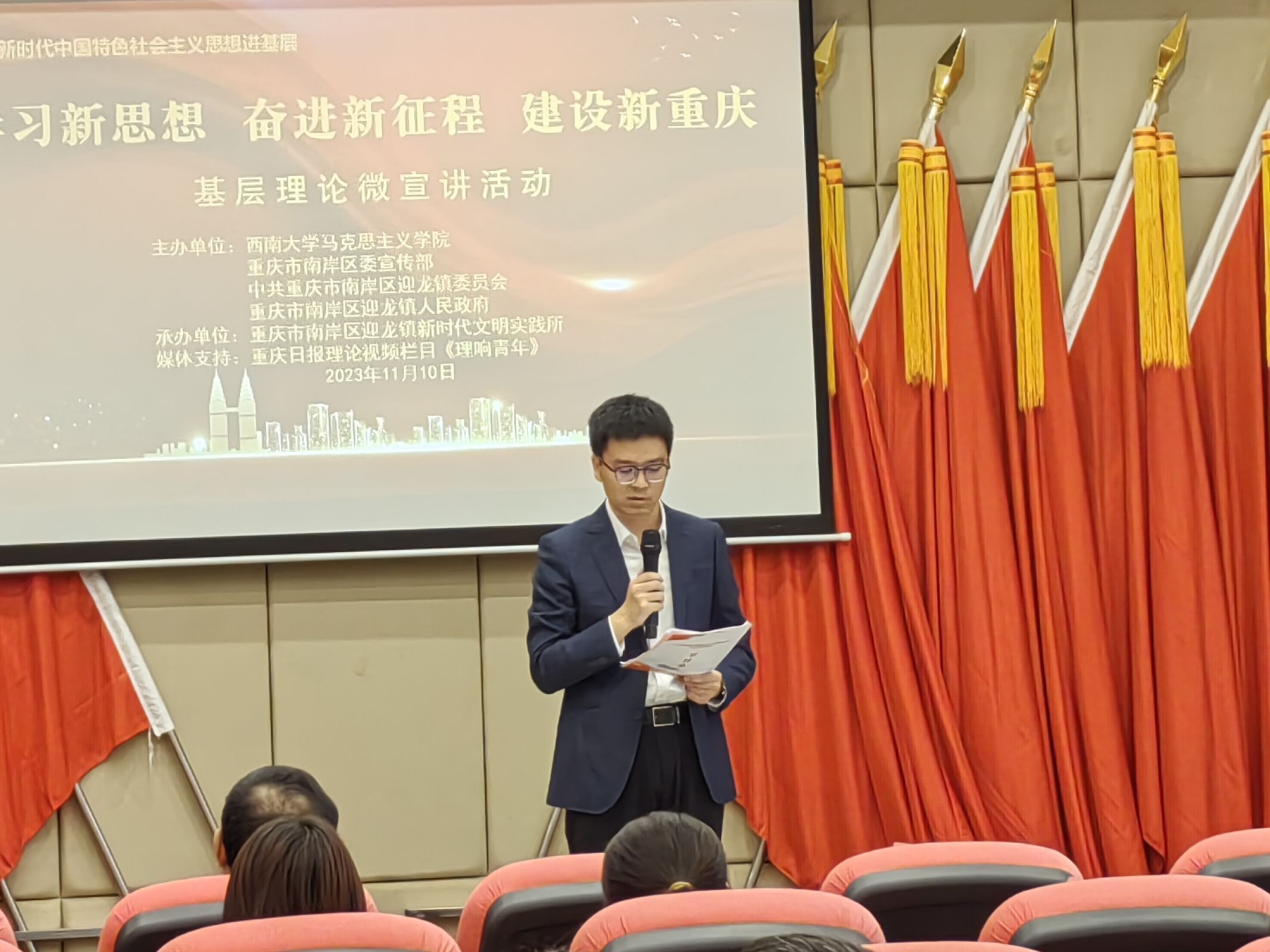 为全面深入学习宣传贯彻习近平新时代中国特色社会主义思想和党的二十大精神,科学把握习近平新时代中国特色社会主义思想,全面提高思想引领能力,yl88858永利中国于2023年11月10日前往南岸区迎龙镇参与基层理论微宜讲活动暨宣传思想文化实践基地签约揭牌仪式,以校地合作的方式推动乡村振兴战略和社会主义核心价值观的广泛传播,进一步开拓中国特色社会主义理论的宣传普及方式。