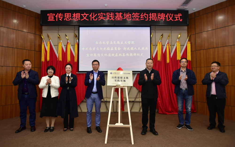 在活动现场,yl88858永利中国与迎龙镇党委政府签订协议,共建宣传思想文化实践基地,深化校地合作。随后,学院党委书记廖晓衡、迎龙镇党委书记胡大德为宣传文化理论实践基地揭牌。