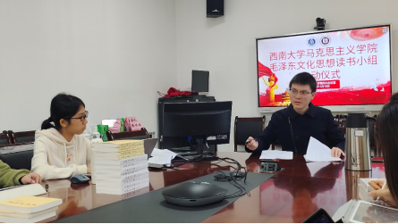 11月16日中午,读书小组在学院502会议室召开研读计划启动会,学院龚锦涛老师出席会议并作动员讲话。会上,龚锦涛老师围绕经典著作研读、理论研究、学习研讨、报告撰写等方面对小组成员提出要求和建议,指出既要深入文本进行研讨,界定核心概念,厘清发展历程,构建理论认识框架,又要跳出文本关照现实,坚持问题导向,观察新时代文化现象,深入探讨“第二个结合”时代命题,鼓励成员们以学铸魂,练好内功、提升修养、增强本领,运用马克思主义立场、观点、方法分析问题,以形成关于毛泽东文化思想的系统化体系化认识。此外,小组成员围绕学习计划、研读方法、活动开展等方面进行交流,组长柳雨杉对下一阶段研读计划进行了部署。