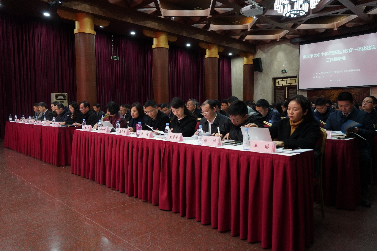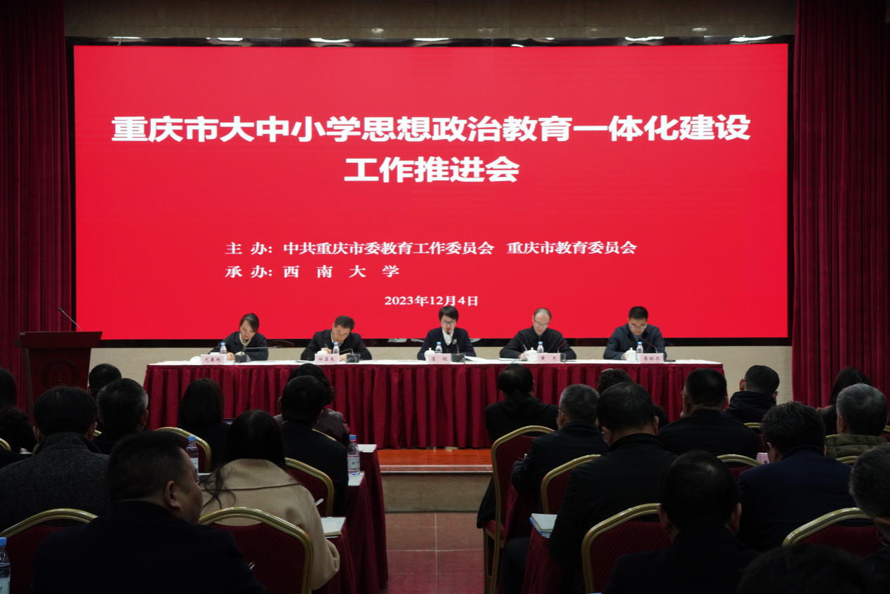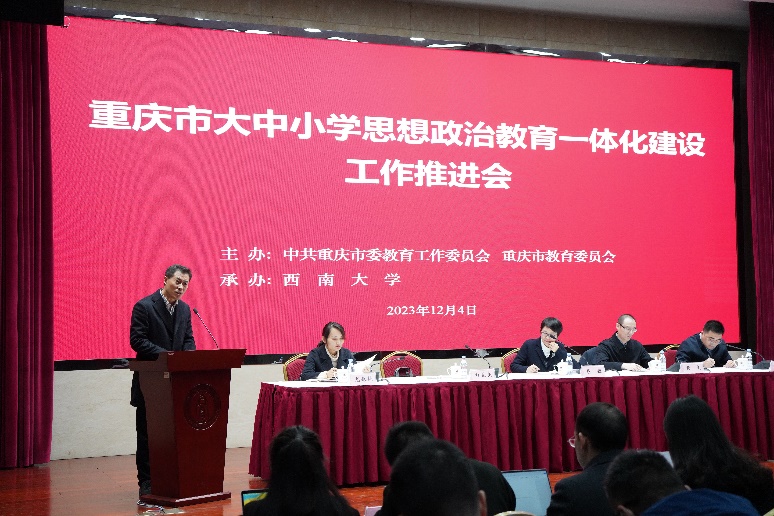 为深入学习贯彻习近平新时代中国特色社会主义思想和党的二十大精神,贯彻落实全国大中小学思想政治教育一体化战略研讨会精神,推进大中小学思想政治教育一体化建设,2023年12月4日,由中共重庆市委教育工作委员会、重庆市教育委员会主办,yl8858永利集团承办的重庆市大中小学思想政治教育一体化建设工作推进会顺利召开。市委教育工委专职副书记屈锐出席会议并讲话。我校是教育部大中小学思政课一体化建设共同体重庆市的牵头单位,学校党委副书记黄杰出席会议并致辞。会议由重庆市教委宣教处处长李林齐主持。