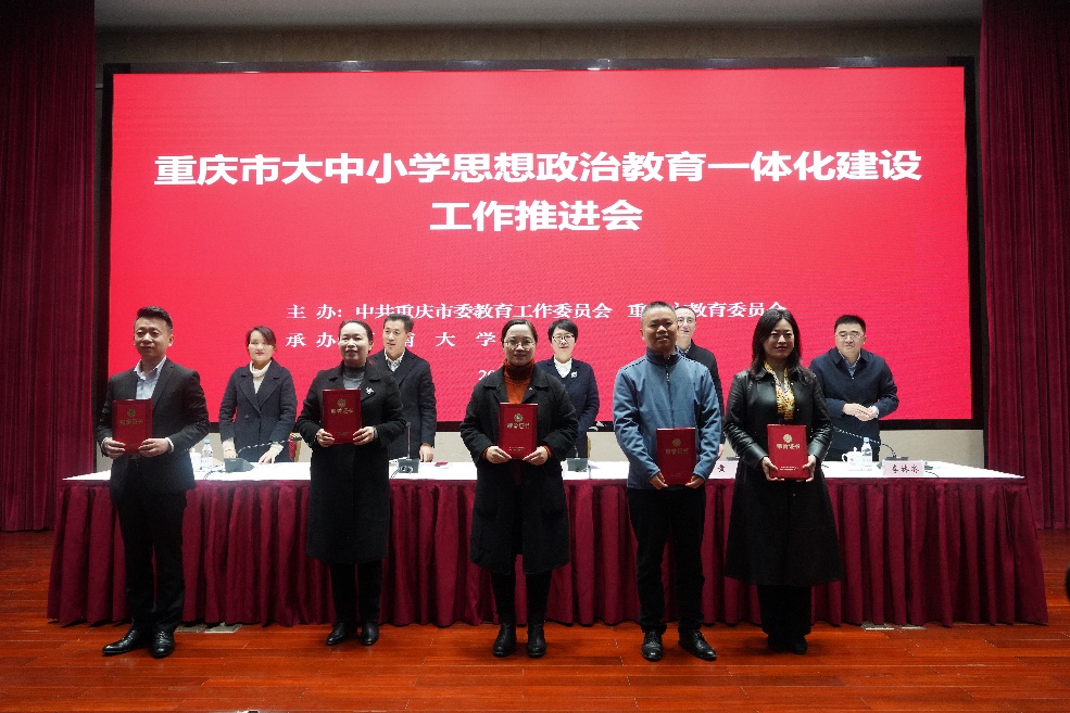市教委宣教处处长李林齐宣读重庆市中小学学思想政治教育一体化建设专题征文活动获奖名单。在主席台就坐的领导为获得征文活动一等奖的作者代表颁奖。市教委宣教处副处长尤春艳传达了全国大中小学思想政治教育一体化战略研讨会精神。