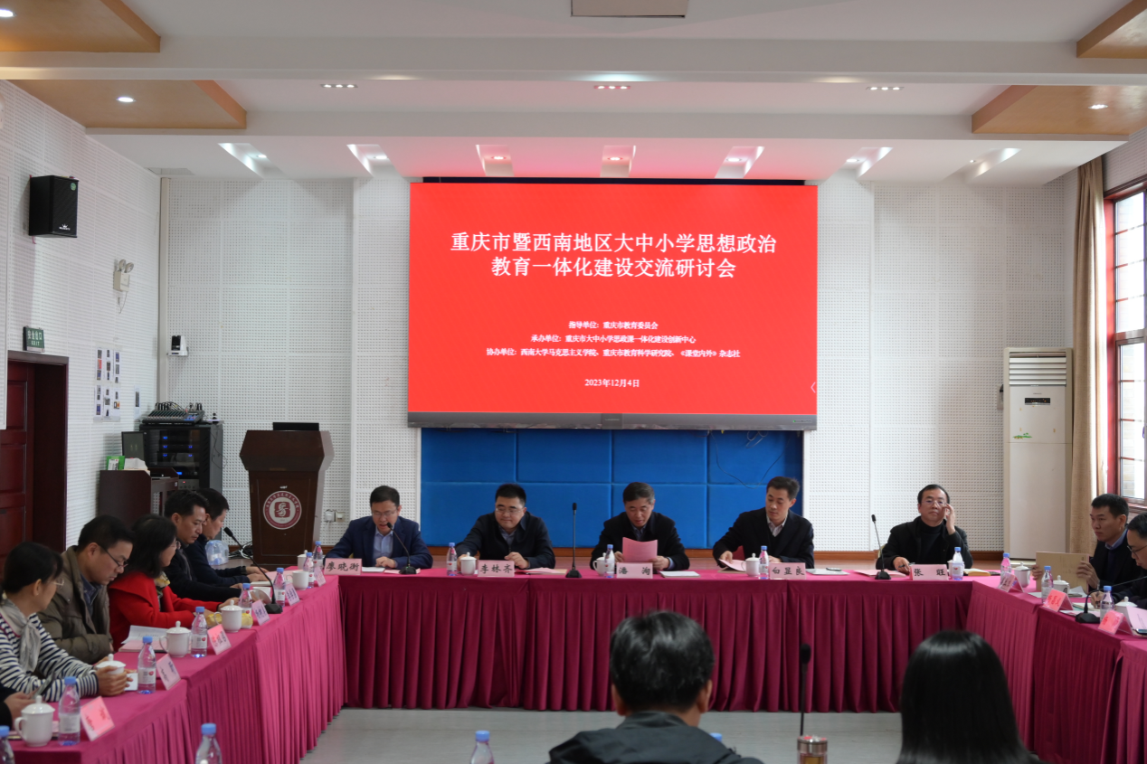 2023年12月4日下午,由重庆市教育委员会指导,重庆市大中小学思政课一体化建设创新中心承办,yl88858永利中国、重庆市教育科学研究员、《课堂内外》杂志社协办的重庆市暨西南地区大中小学思想政治教育一体化建设交流研讨会在学院501报告厅召开。yl8858永利集团党委副书记、yl88858永利中国院长潘洵,教育部大中小学思政课一体化建设指导委员会委员、重庆市大中小学思政课一体化建设分教学指导委员会主任委员白显良,重庆市教委宣教处处长李林齐以及来自西南地区的专家学者参加会议,会议由yl8858永利集团党委宣传部部长、yl88858永利中国党委书记廖晓衡主持。