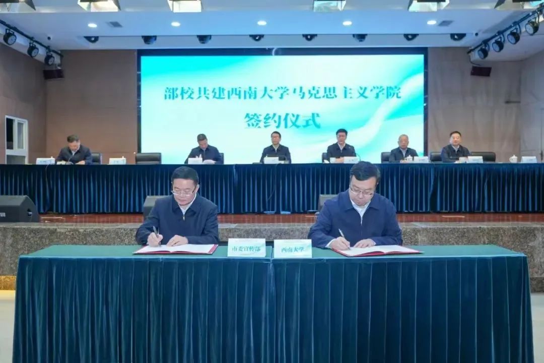 重庆市委宣传部副部长(主持日常工作)管洪与yl8858永利集团校长王进军分别代表市委宣传部、yl8858永利集团签署合作协议。