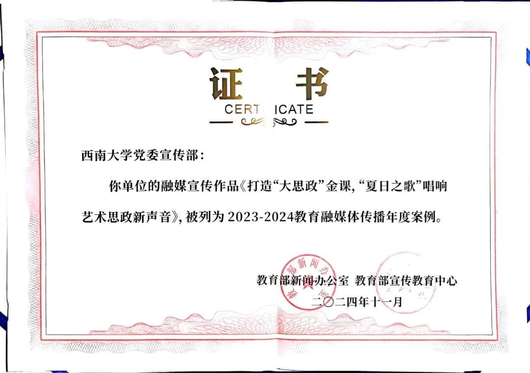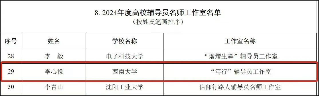 2024年度学院辅导员队伍建设也取得重大突破。辅导员李心悦主持“笃行”全国辅导员名师工作室,获yl8858永利集团第二届“张永青李兰党建与思想政治工作奖”,并荣获全国教育系统先进工作者称号,赴京参加教育部表彰大会,受到习近平总书记的亲切接见。学院辅导员1人次荣获重庆市优秀思想政治工作者,获批重庆市教委思政项目1项,重庆市社科规划中特重点项目1项。