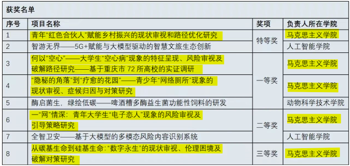 推进“大学生创新实践能力提升‘筑梦’行动”,致力于培养新文科拔尖创新人才。以大学生创新创业训练计划项目、挑战杯学术科技竞赛、中国国际大学生创新大赛“一项目两赛事”为重要抓手,依托“梦想创客”辅导员工作室,采取 “全覆盖发动、有重点培育、全流程辅导、多平台展示”四步工作法, 极大调动学生创新实践参与积极性。荣获中国国际大学生创新大赛全国银奖1项、重庆市金奖2项,“挑战杯”全国大学生创业计划竞赛全国铜奖1项,重庆市金奖1项、银奖1项。“挑战杯”全国大学生课外学术科技品牌竞赛“揭榜挂帅”专项赛全国特等奖1项、一等奖2项、二等奖1项、三等奖1项。国家级大创项目9项,校级大创立项56项。学院团委也在年度考核中获评第一。