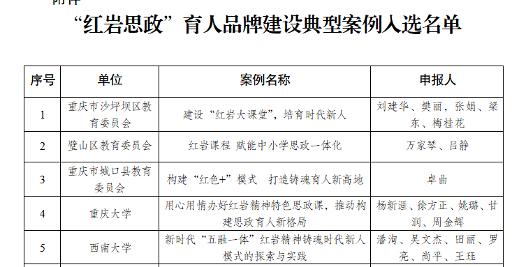 以学生党建为引领,以全国样板党支部为牵引,强化本科学生党支部建设。连续开展“赓续红色血脉,寻访红色基因”大学生社会实践品牌活动、“我为革命文物代言”微视频大赛、参演“千秋红岩”思政大课等特色活动。《新时代“五融一体”红岩精神铸魂时代新人模式的探索与实践》成功入选重庆市教委“红岩思政”育人品牌建设典型案例。