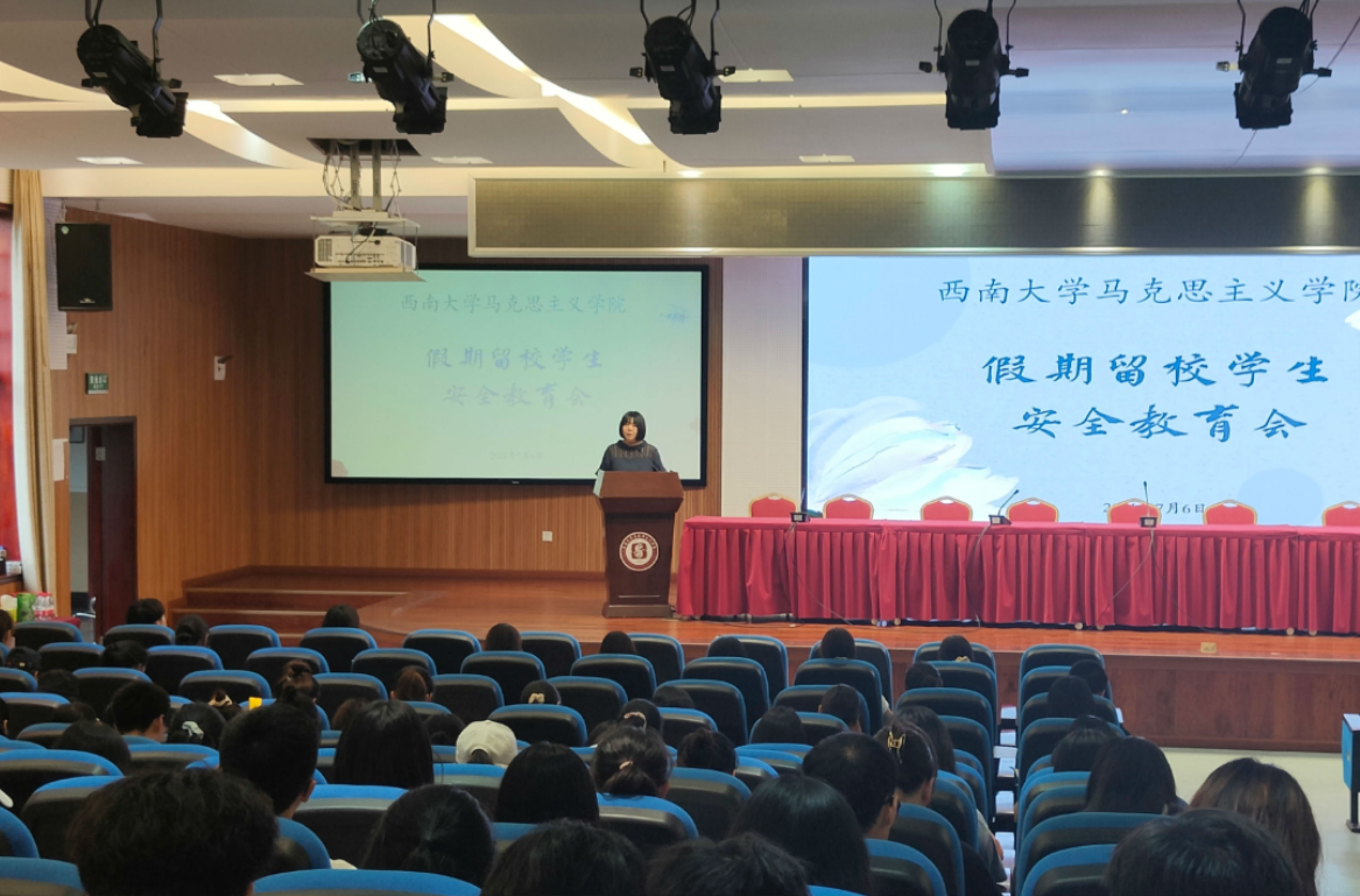 7月6日下午18时,学院于505学术报告厅召开暑期留校学生安全教育大会,学院党委副书记曾艳老师主持会议,辅导员吴克瘟老师、罗艺老师,全体留校本科生到场参加。