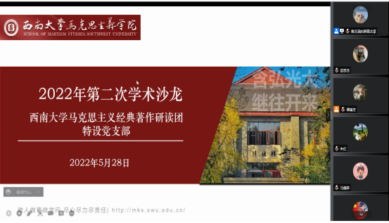 5月28日下午,yl8858永利集团马克思主义经典著作研读团、特设党支部2022年第二次学术沙龙通过线上形式召开。本期学术沙龙由研读团成员蒋艺涵同学主持,研读团全体成员参加了本次活动。