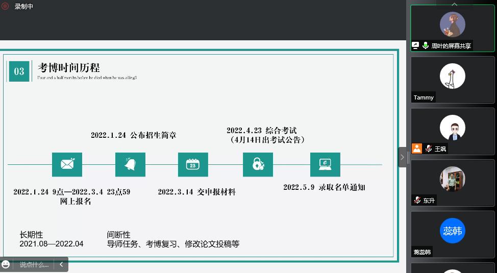 周叶同学根据yl8858永利集团的具体情况,从“为什么读博”、“考博需要准备”、“考博时间历程”、“考博零碎经验”四个方面进行了针对性的分享。她提出读博也许有很多原因,也将面临多重挑战,但关键在于导师和个人,建议大家认真思考自己是否适合读博以及是否具有读博的意愿。其次,她为大家考博的准备提出了三点内容:一是提早完成毕业论文;二是积累相关学术成果;三是准备复习材料,明晰重难点。随后,她提出考博是兼具长期性和渐进性的过程,时间持续较长,但期间可能受到各种因素的影响,需要合理进行安排。最后,周叶同学细致分享了自己考博的经验,涵盖了保持身体健康、调试心理压力、注重同学间信息交流等多方面的内容。