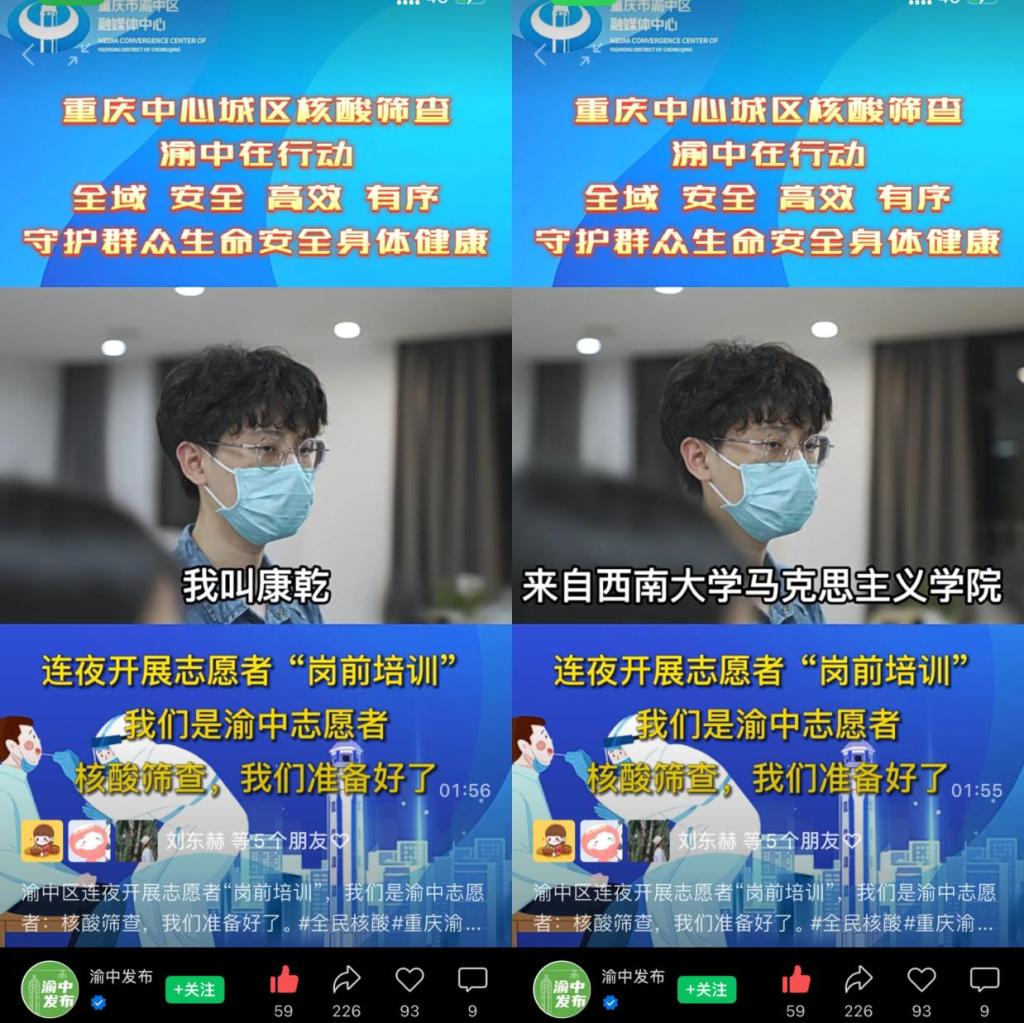 向桂英同学说道:“通过此次志愿服务活动,我也亲自体验到了40多度高温加上防护服的别样汗蒸方式,感受到了每一位医务工作者和志愿者的艰辛。但是我会为超市老板送的一箱箱水,水果店姐姐送的西瓜以及那一句句‘辛苦了!’而感到满足。同时,我也希望能够有更多的爱心人士投入到志愿服务中来,收获‘无价的回报’。我相信重庆人民众志成城,一定能战胜疫情、旱情、火情!”。同时,康乾同学以yl88858永利中国学生的身份接受了渝中区融媒体中心采访,拍摄抗疫纪录片并发布到抖音、微信等平台的官方媒体帐号上。两位同学用热情和奉献,在疫情大考中彰显青春担当,展现了马院学子的优秀品质,用耐心与毅力,展现了学生志愿者的初心使命。