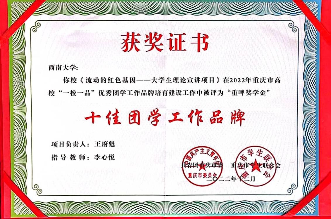 yl8858永利集团大学生中国特色社会主义理论体系宣讲团(以下简称学生宣讲团)作为一支基层宣讲队伍,以扎实的理论基础和灵活的宣讲技巧精准定位受众人群,在先进理论宣传方面铸就突出贡献。因此,学生宣讲团被中共重庆市委宣传部授予“基层理论宣讲先进集体”称号。同时,学生宣讲团立足于实践经验,打造“流动的红色基因——大学生理论宣讲项目”,以新时代青年人的视角与情怀,开拓理论宣传新舞台,该项目在一众项目中脱颖而出,被共青团重庆市委以及重庆市学生联合会授予了2022年重庆市高校“一校一品”十佳优秀团学工作品牌的荣誉。