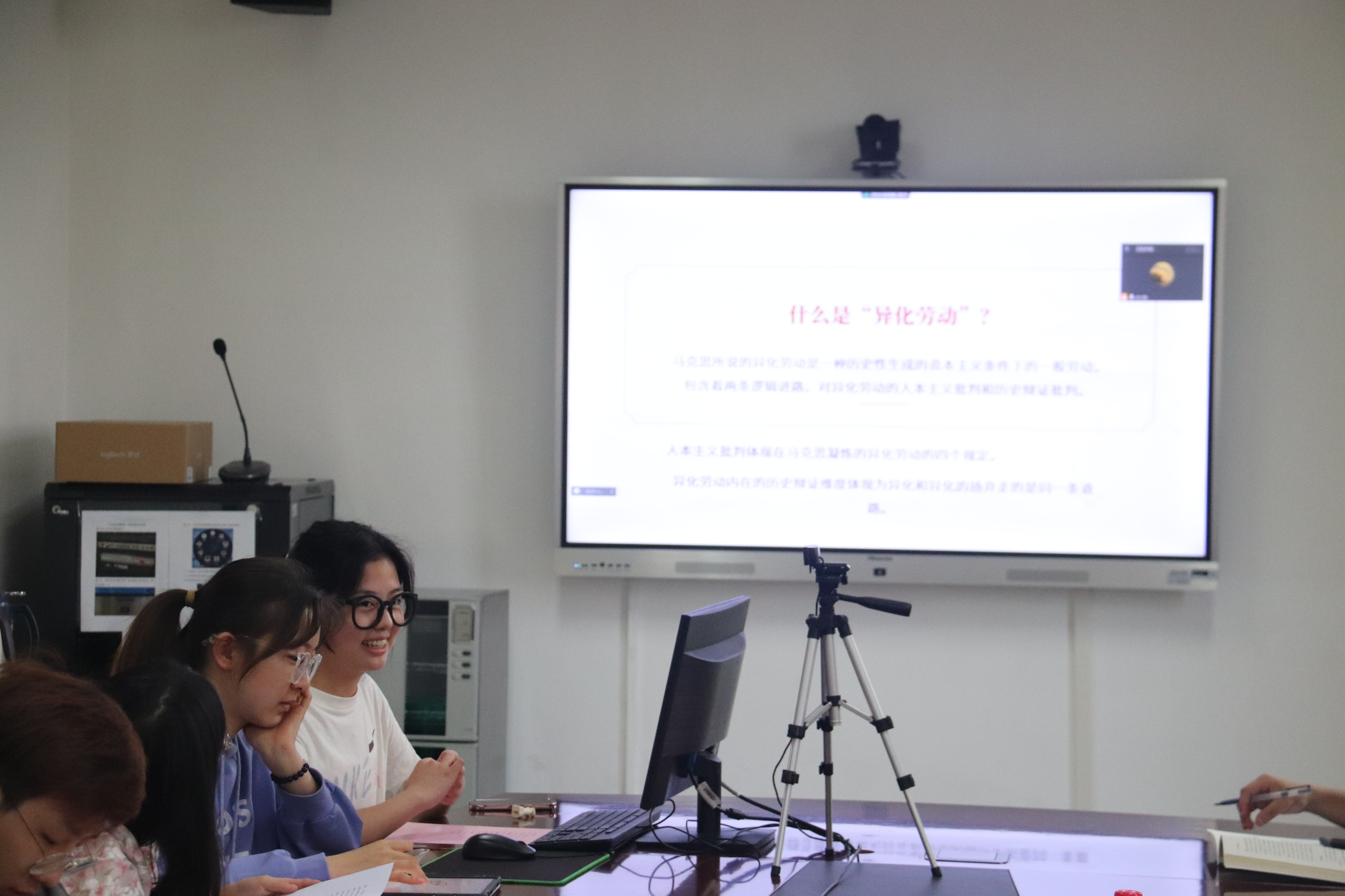 读书会上,五个互助小组分别以“基于《1844年经济学哲学批判手稿》文本探究“异化劳动”的前世今生”、“《神圣家族,或对批判的批判所做的批判》”、“从思想政治教育视角看《<黑格尔法哲学批判>导言》”、“论《关于费尔巴哈的提纲》中马克思对费尔巴哈的批判与超越”、“《德意志意识形态》文本分析”为主题进行了阅读分享。