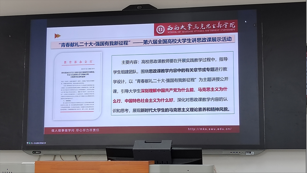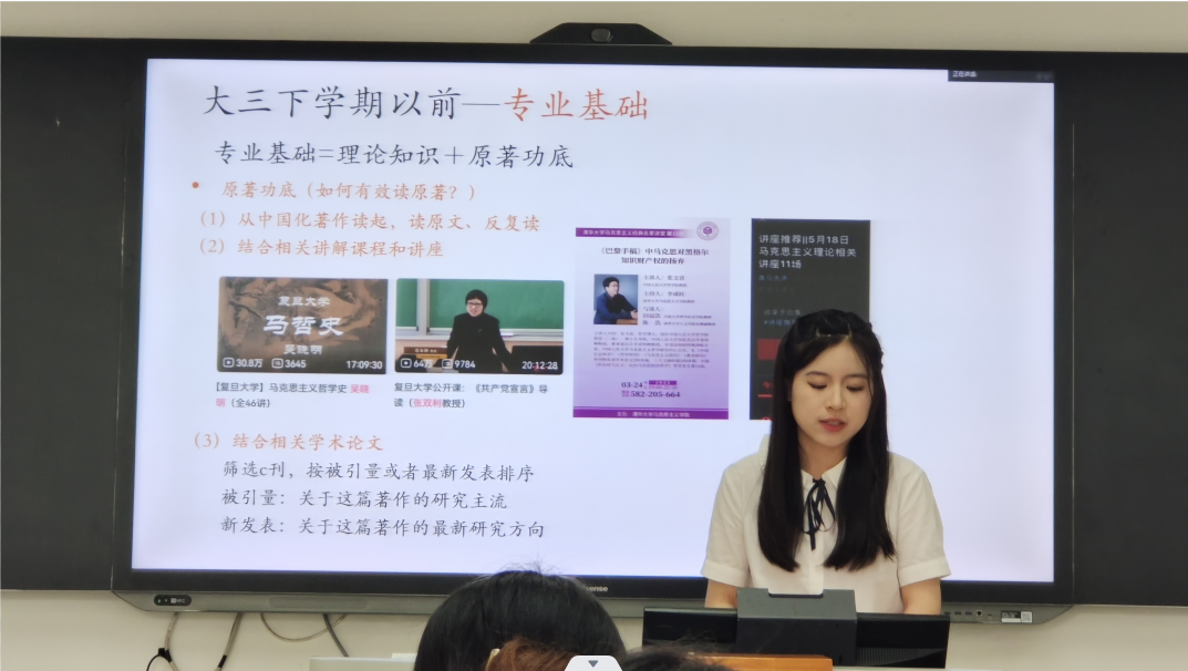 之后,张悦蓉同学分享了参加大学生讲思政课比赛的经验,讲解了比赛的底层逻辑、形式特点和能力需求等内容,并提出了提升教师基本功、全方位用理论武装头脑、积极参加比赛等几点建议。