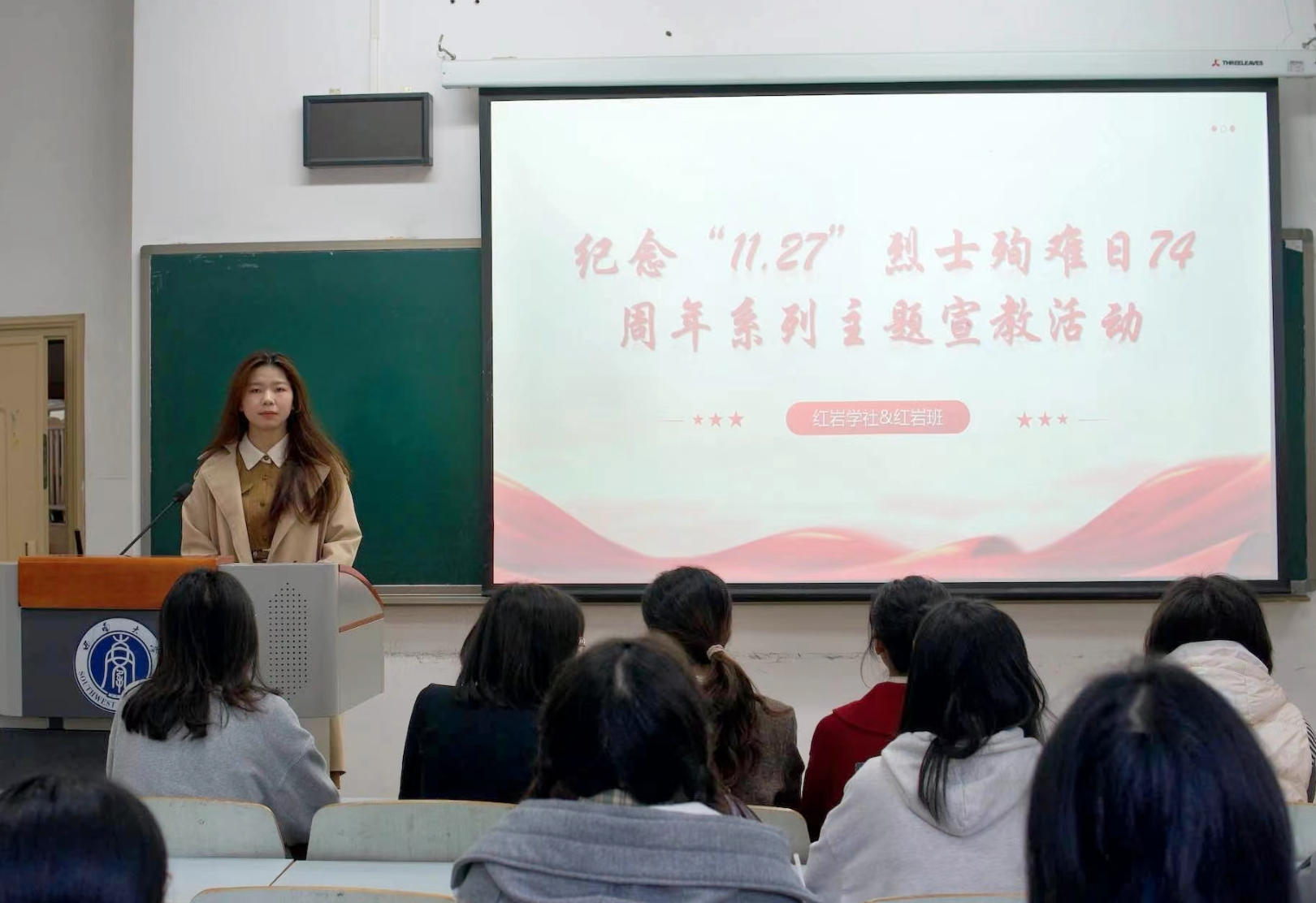 为深切缅怀革命先烈,继承与发扬革命精神,yl8858永利集团红岩菁英班与红岩学社于11月27日下午在十教203联合举办了纪念“11.27”烈士殉难74周年主题教育活动,活动由“红岩学社”社长周梅主持,“红岩菁英班”和“红岩学社”全体成员参与。