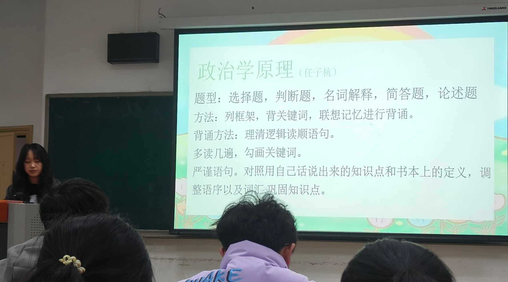 12月6日晚,思想政治教育非师范班在十教203教室召开期末备考经验分享班会,会上,学习委员王颖和李香颖向同学们分享了各科复习资料以及优秀师兄师姐的复习经验和复习方法,再一次对各科考试题型做出了指明,并强调了考试纪律。当晚,思想政治教育师范一班在10教502召开期末备考经验分享会,2022级学生柳雨衫和李溪做备考经验分享。