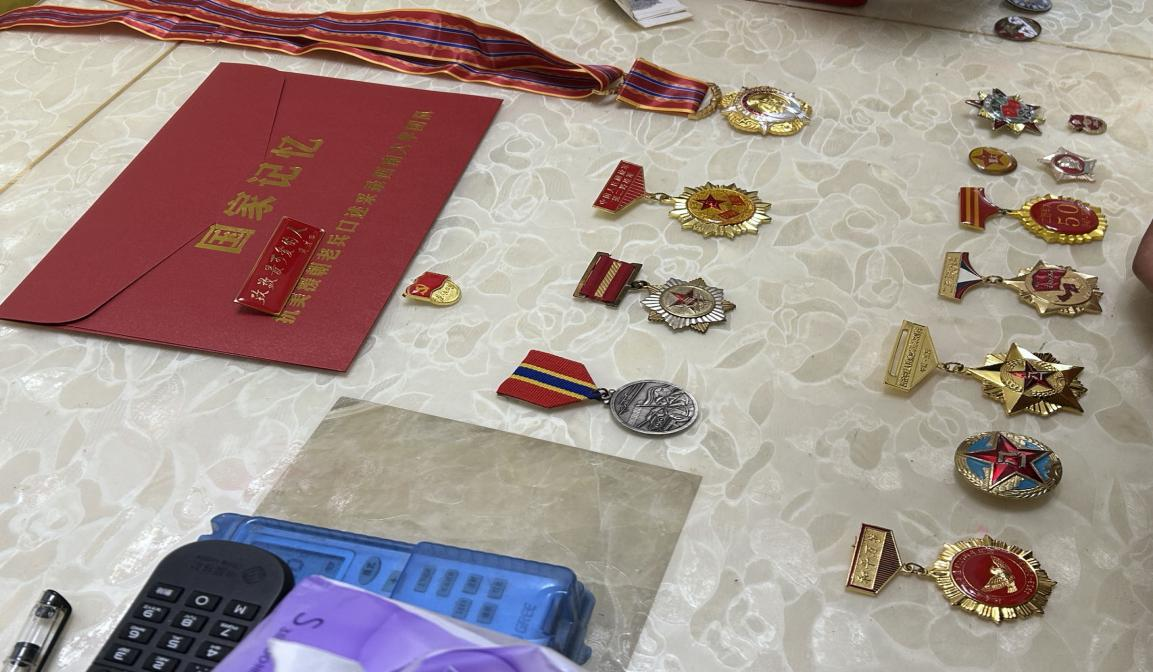 在采访中,几位老战士向队员们展示了他们所获得的各项奖章,这些奖章都是老战士们辉煌过去的证明。