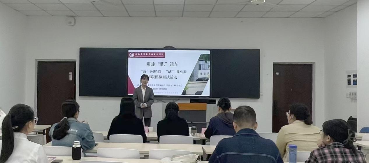 为帮助学院硕士和博士研究生熟悉思政课教师面试的流程并提高面试技巧,10月25日,yl88858永利中国研究生团总支、研究生会在研究生教室一举办了“研途‘职’通车——‘面’向精彩,‘试’出未来”求职模拟面试活动。本次活动邀请了学院钟志凌教授、教师教育学院陈亮教授和yl8858永利集团附属中学汤蕊嘉老师担任评委。