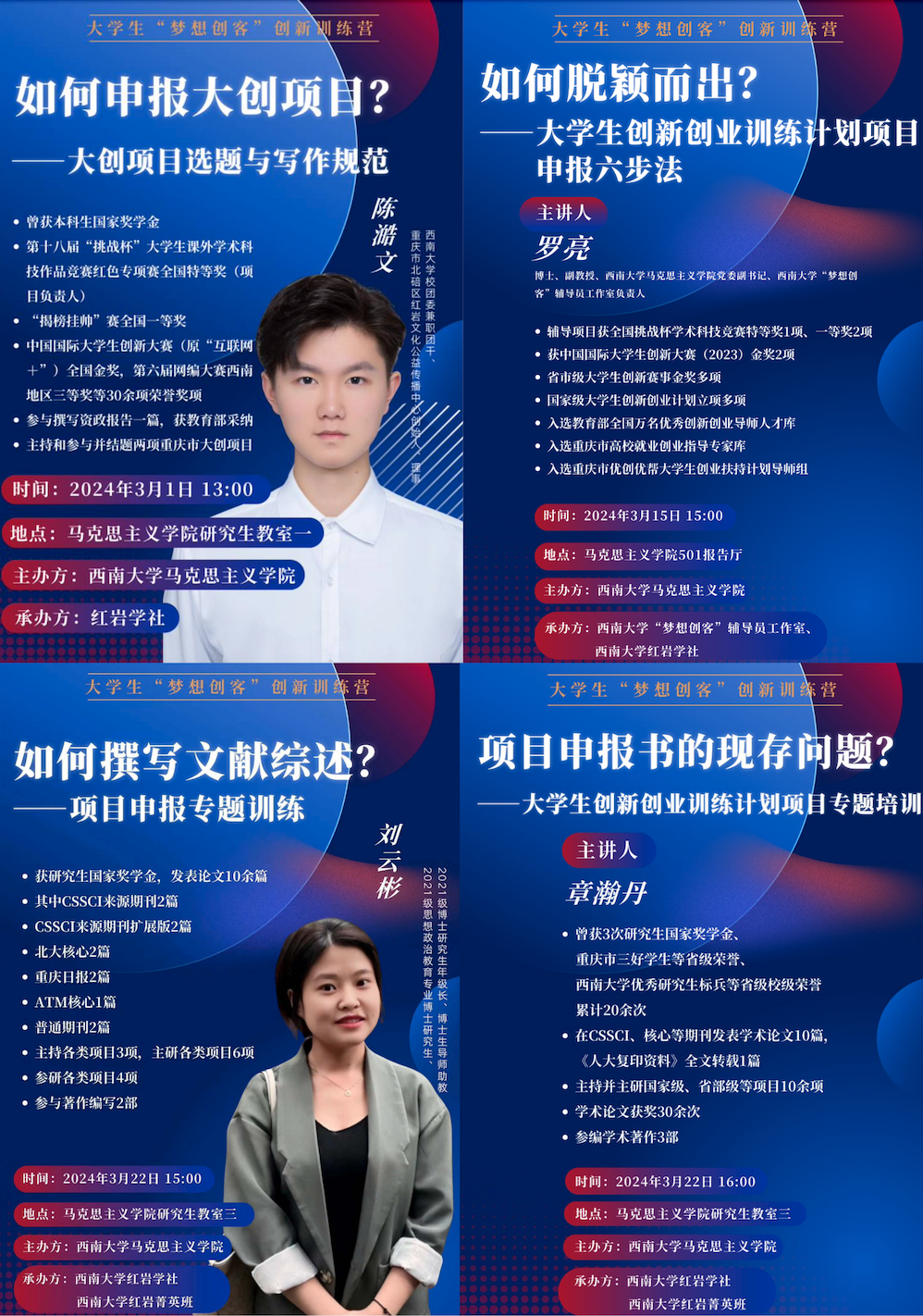 为提升学生科学研究和创新实践能力,3月1日至3月22日,学院依托“梦想创客”辅导员工作室、红岩学社和红岩菁英班,以大创项目为牵引,衔接挑战杯与中国国际大学生创新大赛,推进大学生创新实践能力提升“筑梦”行动,举办了四次大学生创新创业训练计划项目专题培训。