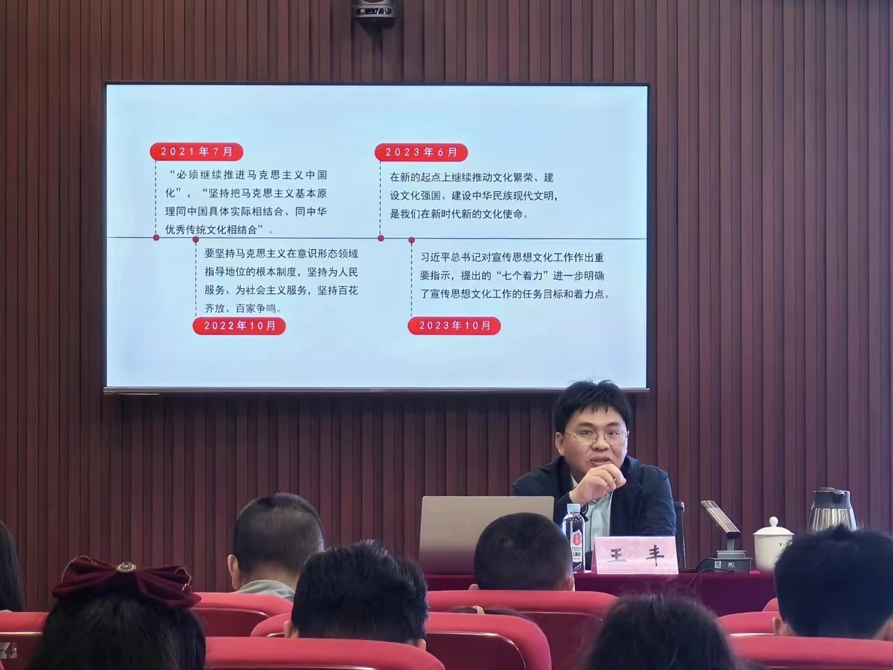 王丰教授从习近平文化思想的形成与发展,如何把握与习近平文化思想相关的几个问题,以及全面领会习近平文化思想的丰富内涵三个方面进行了详细的讲解。