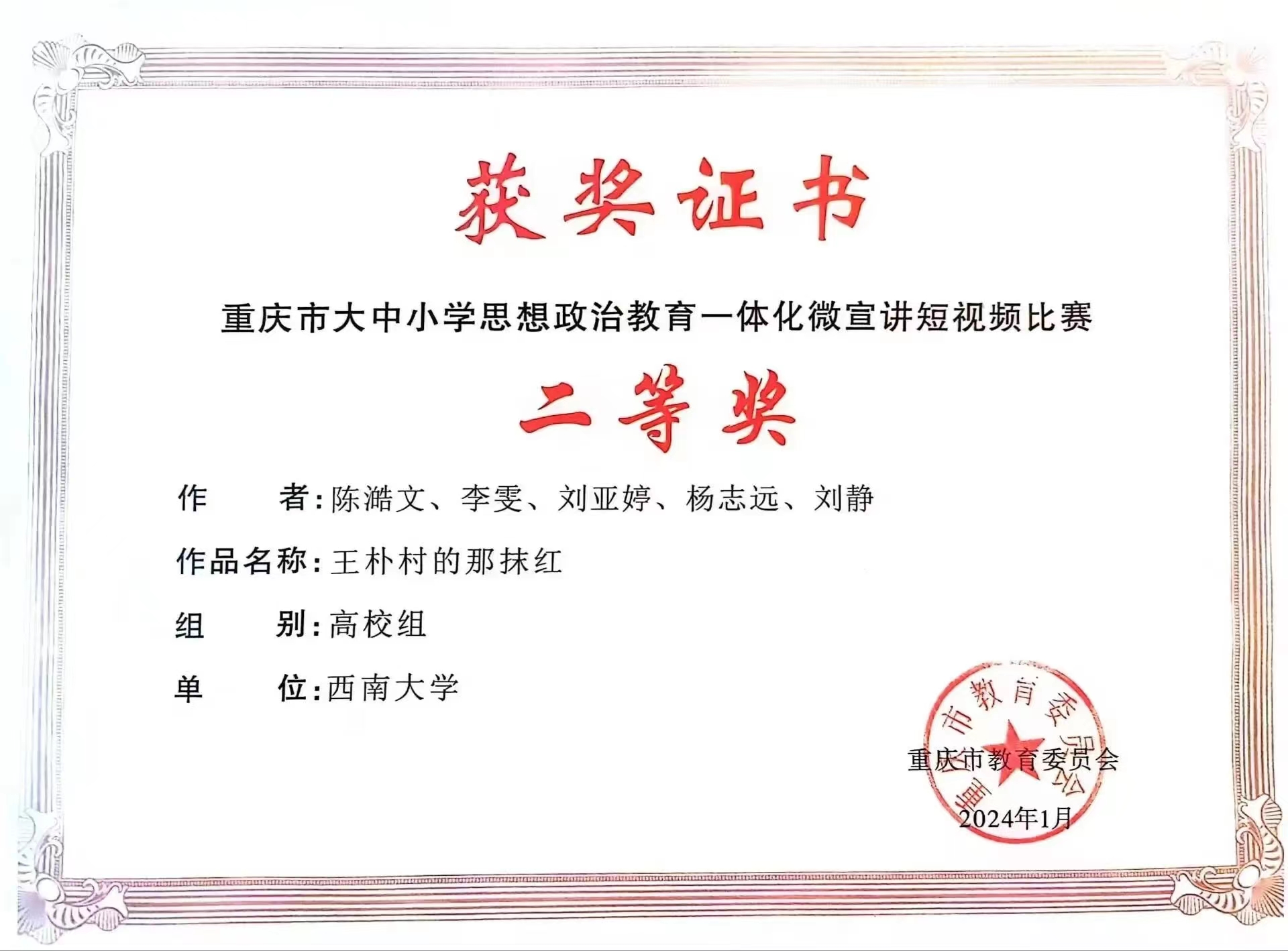 近日,由红岩学社成员陈澔文、李雯等人制作的《王朴村的那抹红》短片荣获重庆市大中小学思想政治教育一体化微宣讲短视频比赛高校组二等奖。