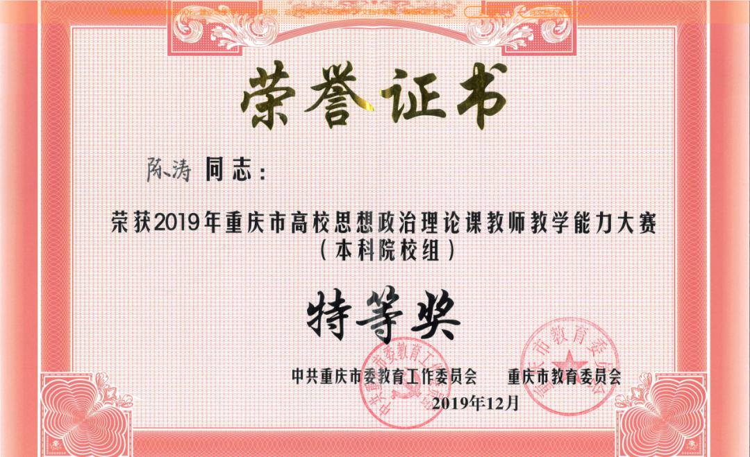 团队骨干成员入选国家级一流本科课程、教育部课程思政示范课程和优秀教学团队、教育部高校思政课“手拉手”集体备课中心(yl8858永利集团)、教育部高校思政课名师工作室(yl8858永利集团)、重庆市一流本科课程等优质课程建设平台。获国家社科基金思政课专项重点项目、重庆市教学成果一等奖、全国高校青年教师教学竞赛思想政治课专项组三等奖、重庆市五一劳动奖章、重庆市高校青年教师教学劳动和技能竞赛思政课专项组一等奖、重庆市高校思想政治理论课教师教学能力大赛(本科院校组)特等奖等多项荣誉。指导学生获“挑战杯”全国大学生课外学术科技作品竞赛三等奖、全国高校大学生讲思政课公开课展示活动二等奖、“华文杯”全国师范生政治学科教学能力测试与展示交流活动一等奖等共10余项奖项。