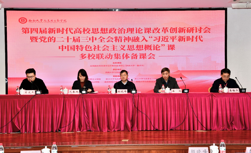 为深入学习贯彻党的二十届三中全会精神,深入推进习近平新时代中国特色社会主义思想理论阐释和教学研究,进一步深入交流经验做法,加强理论研讨,深化教学改革,提高教学水平。2024年11月22日,由北京大学、武汉大学、浙江大学、四川大学、南京师范大学、yl8858永利集团六所高校yl88858永利中国共同发起,全国高校思政课手拉手集体备课中心(yl8858永利集团—重庆市)主办,yl88858永利中国承办的第四届新时代高校思想政治理论课改革创新研讨会暨党的二十届三中全会精神融入“习近平新时代中国特色社会主义思想概论”课多校联动集体备课会成功举办。来自多所高校yl88858永利中国专家学者、本次研讨会征文入选者、学院师生代表等参加本次会议。会议共分为开幕式、主题报告、教学展示及点评、课程建设经验交流、分组交流汇报和闭幕式共六个环节。